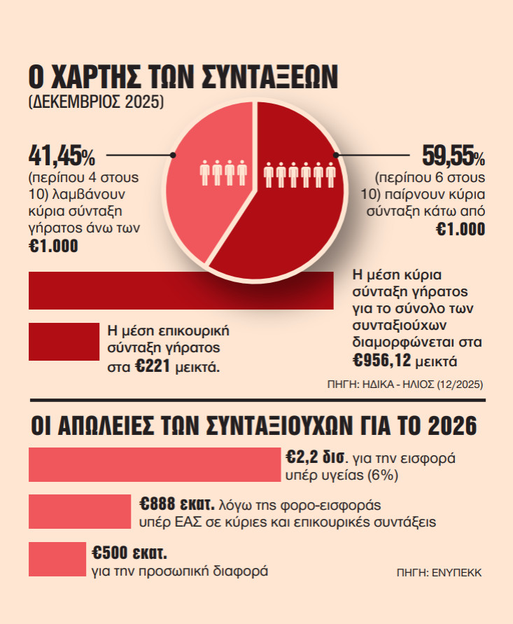 Κι όλα αυτά καταγράφονται όταν οι συνταξιούχοι, εκτός από τα 130 δισ. ευρώ και πλέον που σωρευτικά έχουν χάσει από το 2010 μέχρι σήμερα (2025), με μνημονιακούς νόμους – που δυστυχώς εξακολουθούν ακόμη να ισχύουν –, θα χάσουν επιπλέον 3,5 δισ. ευρώ μόνο για το 2026!