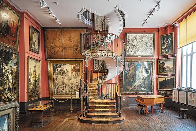 Για μένα, το πιο γοητευτικό μουσείο του Παρισιού είναι το Εθνικό Μουσείο Γκιστάβ Μορό, στο σπίτι όπου έμενε κάποτε ο συμβολιστής ζωγράφος του 19ου αι. Το σύνδρομο Σταντάλ καραδοκεί στον χώρο, καθώς ο επισκέπτης περιπλανιέται ανάμεσα σε μνημειακούς πίνακες, γεμάτους περίτεχνες λεπτομέρειες. Κλασική μυθολογία και οικείες βιβλικές σκηνές παρουσιάζονται σε επιβλητικές επιχρυσωμένες κορνίζες, δίπλα σε πιο ελεύθερα σχέδια και ακουαρέλες. Η σπειροειδής σκάλα που ενώνει τα εργαστήρια ενισχύει τη μαγεία, ενώ τα ιδιωτικά διαμερίσματα προσφέρουν πολύτιμη ματιά σε ένα λαμπρό μυαλό.