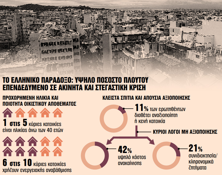 Ετερο σημαντικό ζήτημα που σχετίζεται με τα κλειστά σπίτια είναι το καθεστώς της ιδιοκτησίας και αφορά την ύπαρξη πολλαπλών κληρονόμων/ιδιοκτητών της ίδιας κατοικίας. Ενας στους πέντε (21%) ιδιοκτήτες που διαθέτουν αναξιοποίητη κατοικία αναφέρει ότι δεν τη «βγάζει» στην αγορά λόγω έλλειψης συνεννόησης μεταξύ των κληρονόμων.