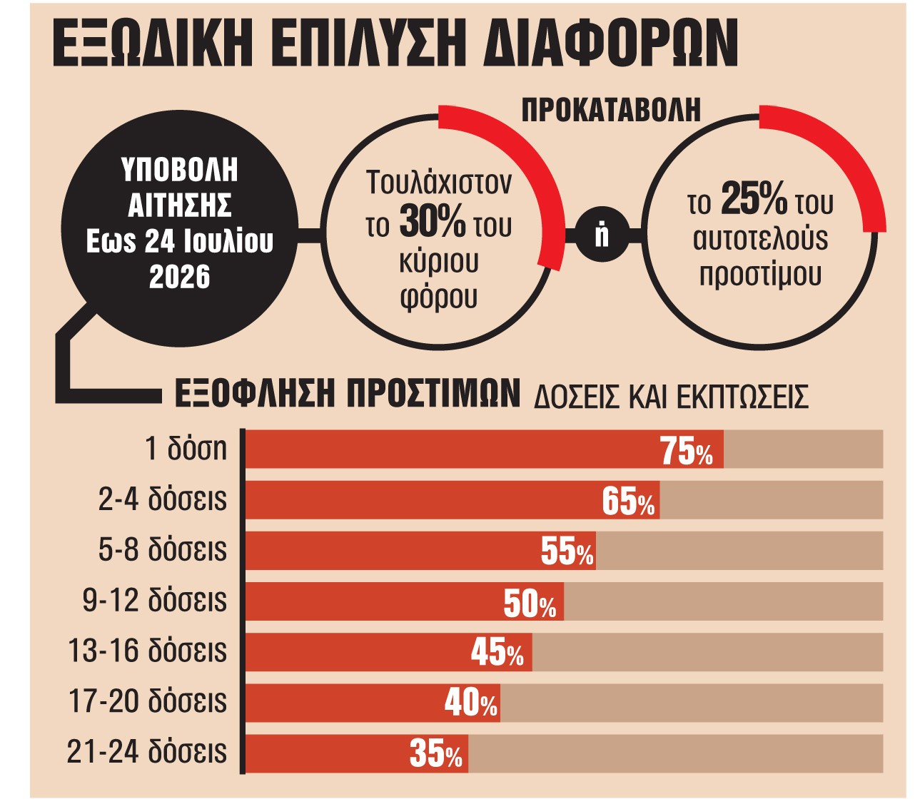 Αίτημα για εξώδικη επίλυση της διαφοράς μπορούν να υποβάλουν ηλεκτρονικά έως τις 24 Ιουλίου 2026 όσοι έχουν εκκρεμείς φοροϋποθέσεις ενώπιον του Συμβουλίου της Επικρατείας και των Τακτικών Διοικητικών Δικαστηρίων αλλά και οι φορολογούμενοι με υποθέσεις που εκκρεμούν και δεν θα έχουν συζητηθεί, ενώπιον του Συμβουλίου της Επικρατείας και των τακτικών διοικητικών δικαστηρίων, έως τις 23 Ιουλίου 2026.