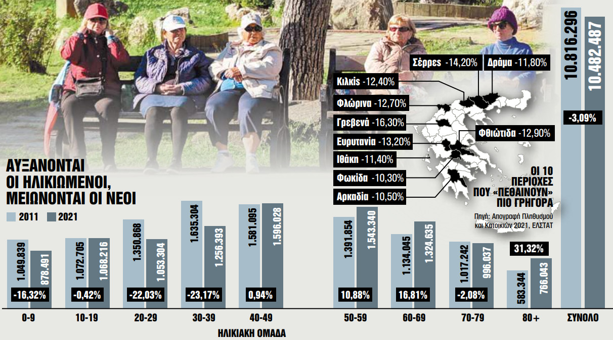 Πέραν της μείωσης του πληθυσμού, όμως, τα στοιχεία καταγράφουν και το πρόβλημα της γήρανσης. Σύμφωνα με την απογραφή του 2021, ο μόνιμος πληθυσμός της χώρας είναι 10.482.487 άτομα, μειωμένος κατά 3,1% σε σχέση με το 2011. Οι γυναίκες είναι ελαφρώς περισσότερες από τους άνδρες (51,1% έναντι 48,9%), το 44% είναι άνω των 50 ετών και μόλις το 29% είναι κάτω από 30. Στην αντίστοιχη μέτρηση του 2011, οι άνω των 50 αποτελούσαν το 38% του συνολικού πληθυσμού, ενώ το 32% ήταν κάτω από 30.