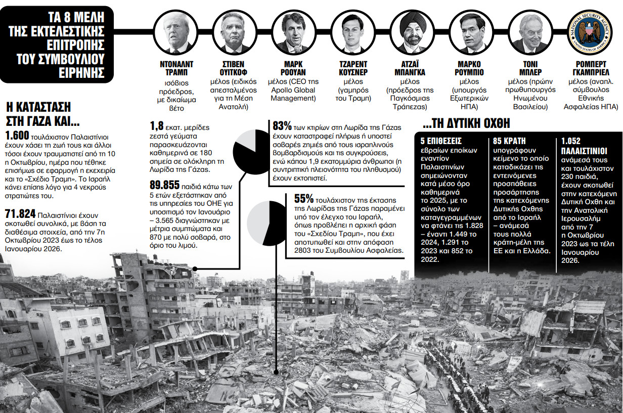 Το σίγουρο, σε κάθε περίπτωση, είναι πως οι Παλαιστίνιοι δεν έχουν κανένα λόγο να είναι ικανοποιημένοι με τις εξελίξεις, ούτε ελπίζουν σε κάτι καλύτερο από το Συμβούλιο Ειρήνης. Τις τελευταίες μέρες, άλλωστε, το Ισραήλ δείχνει αποφασισμένο να επιταχύνει τις διαδικασίες που τελικά οδηγούν στην προσάρτηση μεγάλου μέρους των κατεχόμενων εδαφών της Δυτικής Οχθης, προκαλώντας και την αντίδραση μεγάλου μέρους της διεθνούς κοινότητας, όπως αποδεικνύει σχετική επιστολή που υπογράφουν κάπου 85 χώρες.