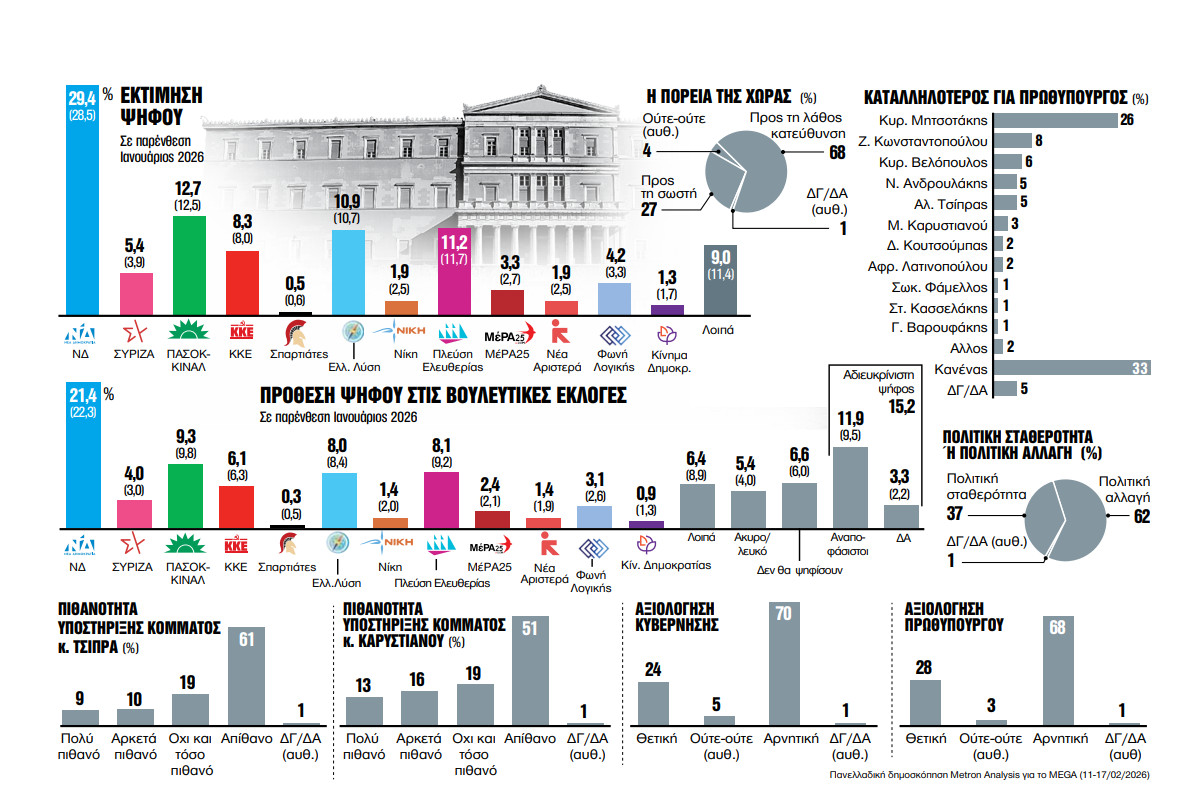Στην πρόθεση ψήφου τόσο η ΝΔ όσο και το ΠΑΣΟΚ εμφανίζονται με χαμηλότερα ποσοστά από τη μέτρηση του Ιανουαρίου. Καθοριστικός παράγοντας για την εκτίμηση ψήφου είναι, όμως, η αναγωγή της αδιευκρίνιστης ψήφου που φτάνει σε αυτή τη μέτρηση το 15,2%. Ετσι, στην εκτίμηση ψήφου, η ΝΔ προηγείται με 29,4% κι ελαφρά αύξηση από τον περασμένο μήνα και το ΠΑΣΟΚ ακολουθεί στη δεύτερη θέση με 12,7%. Τρίτη παραμένει η Πλεύση Ελευθερίας συγκεντρώνοντας 11,2%, ενώ η Ζωή Κωνσταντοπούλου παραμένει πρώτη στα ποσοστά δημοφιλίας των αρχηγών.