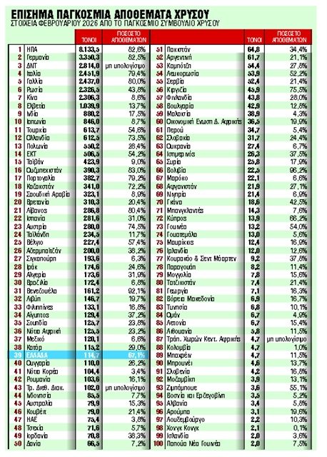 Οι κεντρικές τράπεζες από όλο τον κόσμο αγόρασαν 19 τόνους χρυσού τον Δεκέμβριο του 2025, όπως προκύπτει από στοιχεία του Παγκόσμιου Συμβουλίου Χρυσού, ανεβάζοντας τις αναφερόμενες καθαρές αγορές για ολόκληρο το προηγούμενο έτος σε 328 τόνους. Το 2024 είχαν καταγραφεί καθαρές αγορές της τάξεως των 345 τόνων.