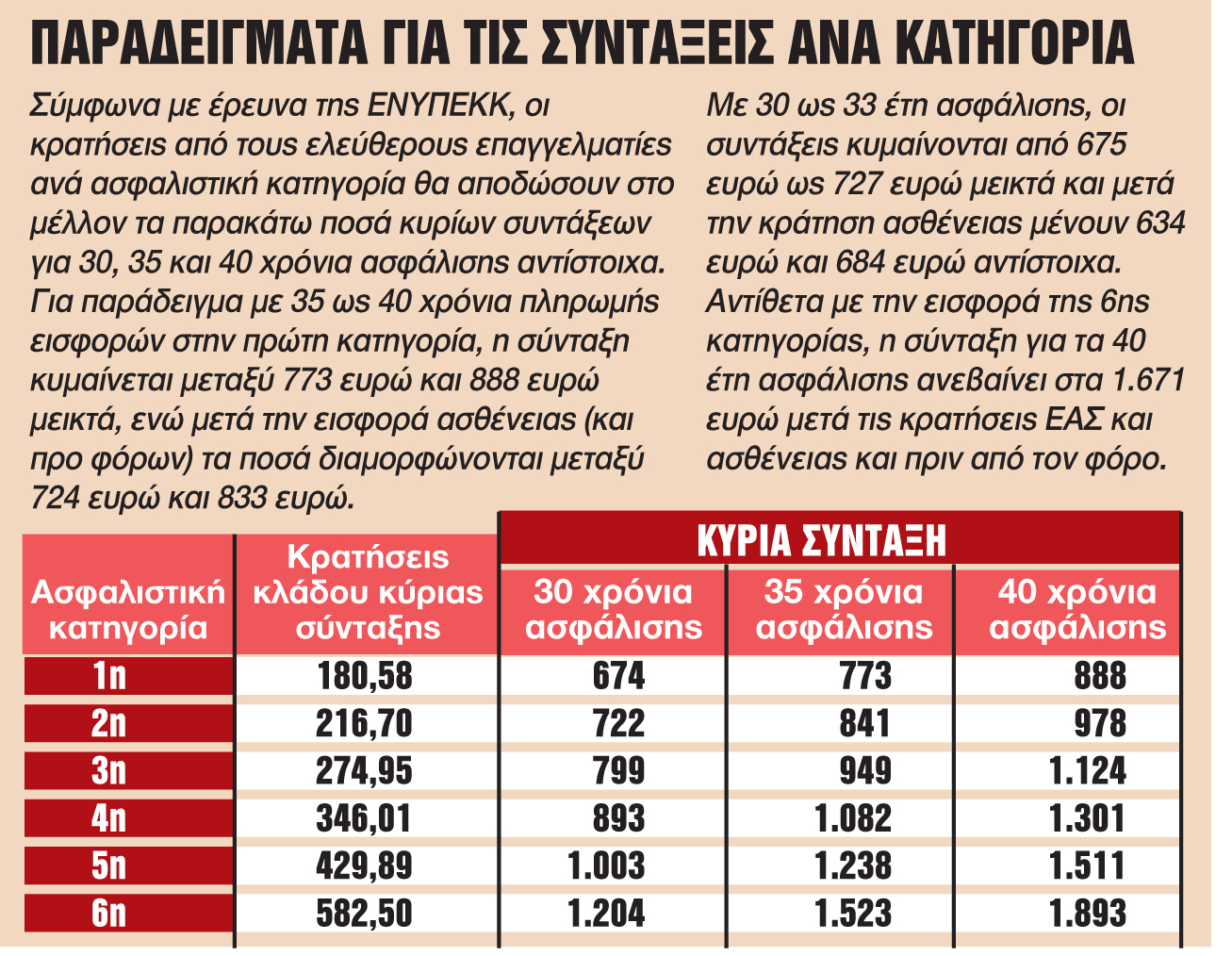 Ο πρώτος ασφαλισμένος, με 40ετία, θα λάβει σύνταξη της τάξεως των 890 ευρώ (μεικτά), ενώ εκείνος που ασφαλίζεται στην 6η και ακριβότερη κατηγορία θα λάβει 1.895 ευρώ (με συμπληρωμένα 40 έτη ασφάλισης).