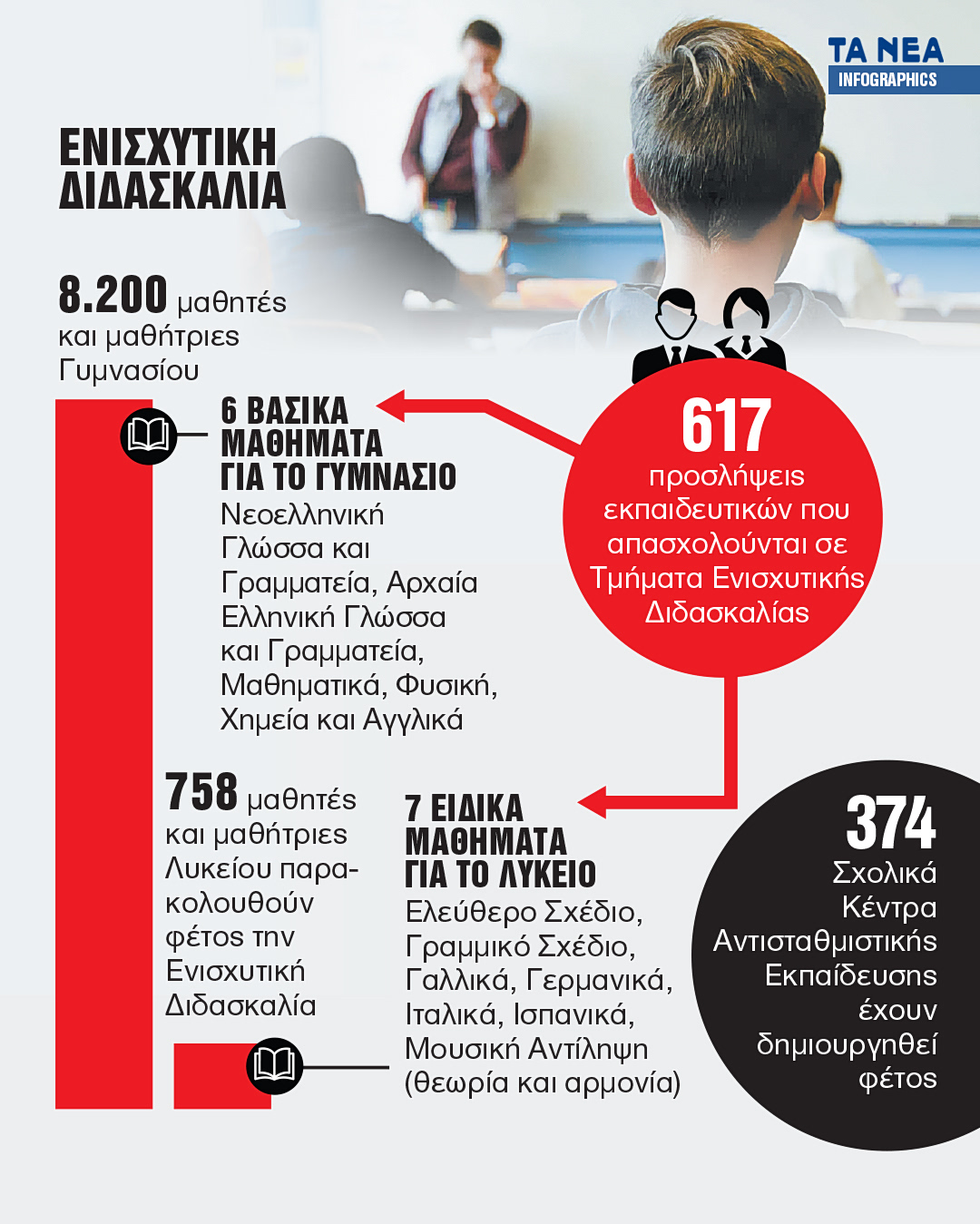 Προσφέρει, με άλλα λόγια, εξατομικευμένη υποστήριξη, περισσότερη εξάσκηση και καλύτερη προετοιμασία για διαγωνίσματα και εξετάσεις των βασικών μαθημάτων. Φέτος τα μαθήματα παρακολουθούν 8.271 μαθητές. Αντίστοιχα, στο Λύκειο (και συγκεκριμένα τη Γ΄ Τάξη Λυκείου και τη Δ΄ Τάξη Λυκείου των Ενιαίων Ειδικών Επαγγελματικών Γυμνασίων – Λυκείων) η Ενισχυτική Διδασκαλία αφορά 7 ειδικά μαθήματα, τα οποία δεν περιλαμβάνονται μεν στο ωρολόγιο πρόγραμμα αλλά είναι πανελλαδικώς εξεταζόμενα για την εισαγωγή σε κάποιες σχολές Τριτοβάθμιας Εκπαίδευσης: Ελεύθερο Σχέδιο, Γραμμικό Σχέδιο, Γαλλικά, Γερμανικά, Ιταλικά, Ισπανικά, Μουσική Αντίληψη (θεωρία και αρμονία).
