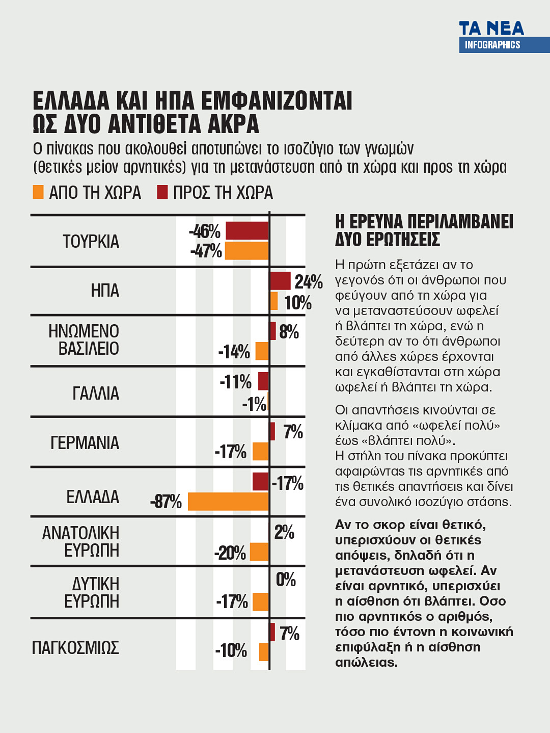 Το ελληνικό -87% για τη μετανάστευση προς το εξωτερικό αποτελεί το πιο αρνητικό ισοζύγιο μεταξύ των 60 χωρών της έρευνας.