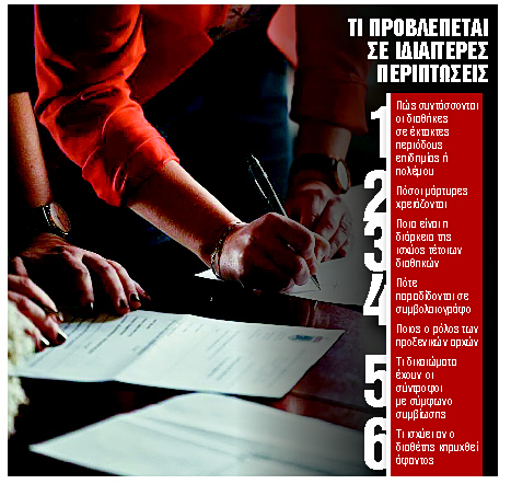 «ΤΑ ΝΕΑ», που στη διαδρομή του σύνθετου αυτού νομοθετήματος, το οποίο έχει μεγάλη ανταπόκριση, έχουν ενδελεχώς ασχοληθεί με σχεδόν όλες τις κρίσιμες πτυχές του, αποκαλύπτουν τι ακριβώς προβλέπει ο νομοθέτης και για τις περιπτώσεις των έκτακτων διαθηκών, που λόγω των διεθνών συνθηκών και του πολέμου καθίστανται επίκαιρες.