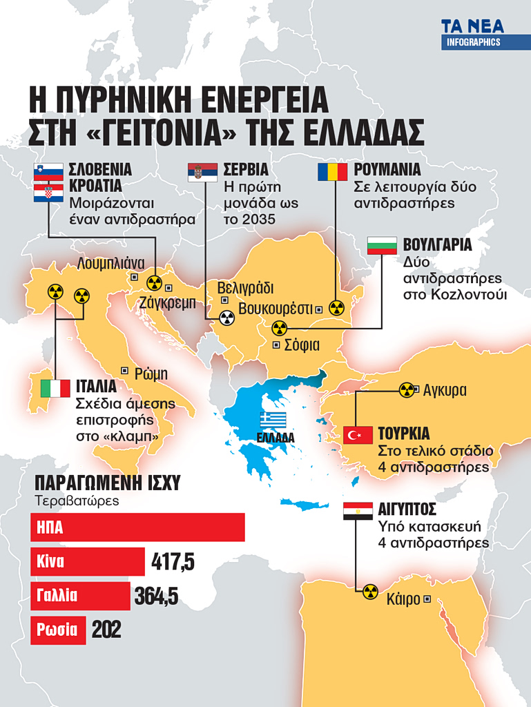Η Ελλάδα δεν είναι η μοναδική χώρα στην ευρύτερη περιοχή και συνολικά στην Ευρωπαϊκή Ενωση που «γοητεύεται» από την πυρηνική ενέργεια. Οι περισσότεροι γείτονές της είτε διαθέτουν ήδη αντιδραστήρες σε λειτουργία (Βαλκάνια) είτε τους κατασκευάζουν (Τουρκία, Αίγυπτος) είτε εξετάζουν σοβαρά την επαναλειτουργία εκείνων που είχαν απενεργοποιήσει πριν από αρκετά χρόνια (Ιταλία), ακολουθώντας το ρεύμα της απεξάρτησης από τη συγκεκριμένη μορφή, η οποία είχε χαρακτηριστεί ως η πλέον επικίνδυνη για την ανθρωπότητα. Δικαίως, σε μεγάλο βαθμό, εξαιτίας τόσο των κινδύνων από πιθανά δυστυχήματα – κανείς δεν έχει ξεχάσει το Τσέρνομπιλ, το Θρι Μάιλ Αϊλαντ και τη Φουκουσίμα – όσο και της μεγάλης διάρκειας ζωής των αποβλήτων.