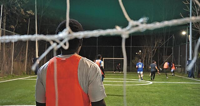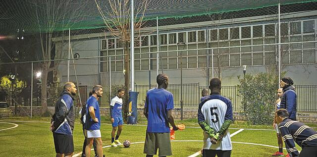 Μερικά μέτρα πιο κάτω, σε ένα μικρό γήπεδο πέντε επί πέντε, ετοιμάζεται για την προπόνησή της μια άλλη ομάδα. Εδώ δεν υπάρχει καμία ομοιομορφία. Κάποιοι είναι λευκοί και άλλοι μαύροι. Κάποιοι φορούν ποδοσφαιρικά παπούτσια, άλλοι όχι. Κάποιοι μιλούν ελληνικά, άλλοι αγγλικά και γαλλικά και άλλοι άγνωστες (σε εμάς) γλώσσες. Κάποιοι δείχνουν έμπειροι, ενώ για άλλους είναι η πρώτη προπόνηση. Δεν υπάρχει εξέδρα, ούτε βέβαια και θεατές.