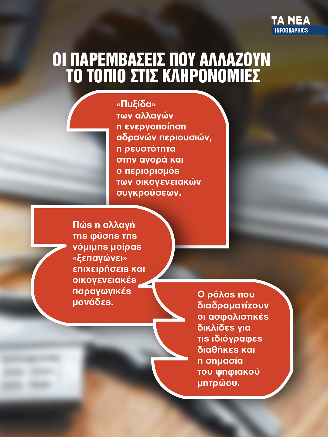 H αξιοποίηση της ακίνητης περιουσίας, η ενεργοποίηση σημαντικών αδρανών περιουσιακών μεριδίων και η ρευστότητα στην αγορά σε συνδυασμό με την προσπάθεια να περιοριστούν συγκρούσεις και ενδοοικογενειακές αντιδικίες που κρατούν «παγωμένες» επιχειρήσεις και άλλα περιουσιακά στοιχεία αποτελούν τέσσερα βασικά «συστατικά» των αλλαγών που περιλαμβάνονται στο κληρονομικό νομοσχέδιο.