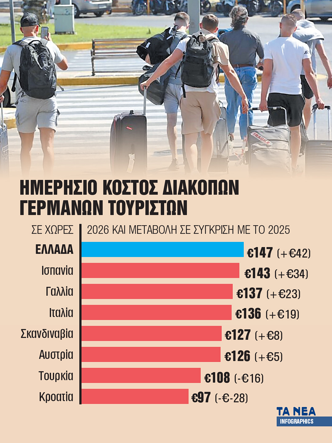 Πρόσφατα στοιχεία του Stiftung für Zukunft Fragen δείχνουν ότι η μέση ημερήσια δαπάνη ανά ταξιδιώτη στην Ελλάδα φτάνει τα 147 ευρώ, ξεπερνώντας ακόμη και την Ισπανία (143 ευρώ), βασικό ανταγωνιστή στη Μεσόγειο. Η εξέλιξη αυτή εντείνει τις ανησυχίες για τη βιωσιμότητα της τιμολογιακής πολιτικής, ειδικά σε ένα περιβάλλον όπου η ζήτηση ενδέχεται να παρουσιάσει κάμψη λόγω του πολέμου στη Μέση Ανατολή.