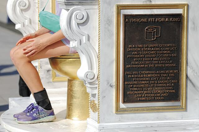 Γλυπτό που εκτίθεται στην Ουάσιγκτον, εμπνευσμένο από την ανακαίνιση που έκανε ο Τραμπ στην τουαλέτα του Λίνκολν στον Λευκό Οίκο. Ο τίτλος είναι «Eνας θρόνος κατάλληλος για έναν βασιλιά»…