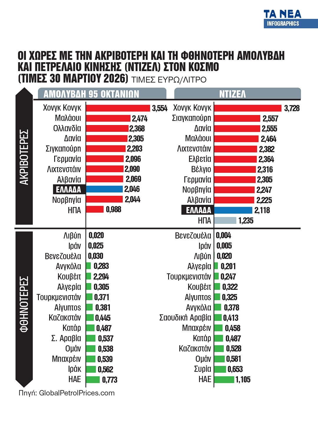 Η Ελλάδα επίσης είναι η δέκατη έβδομη πιο ακριβή χώρα στον κόσμο στο πετρέλαιο κίνησης (ντίζελ με 2,118 ευρώ το λίτρο). Πρόκειται για τιμές οι οποίες προκύπτουν από την επεξεργασία των στοιχείων που πραγματοποίησε για τις 30 Μαρτίου του 2026 η Global Petrol Prices (globalpetrolprices.com), όπως αυτές διαμορφώνονταν έναn μήνα μετά την έναρξη του πολέμου στη Μέση Ανατολή.