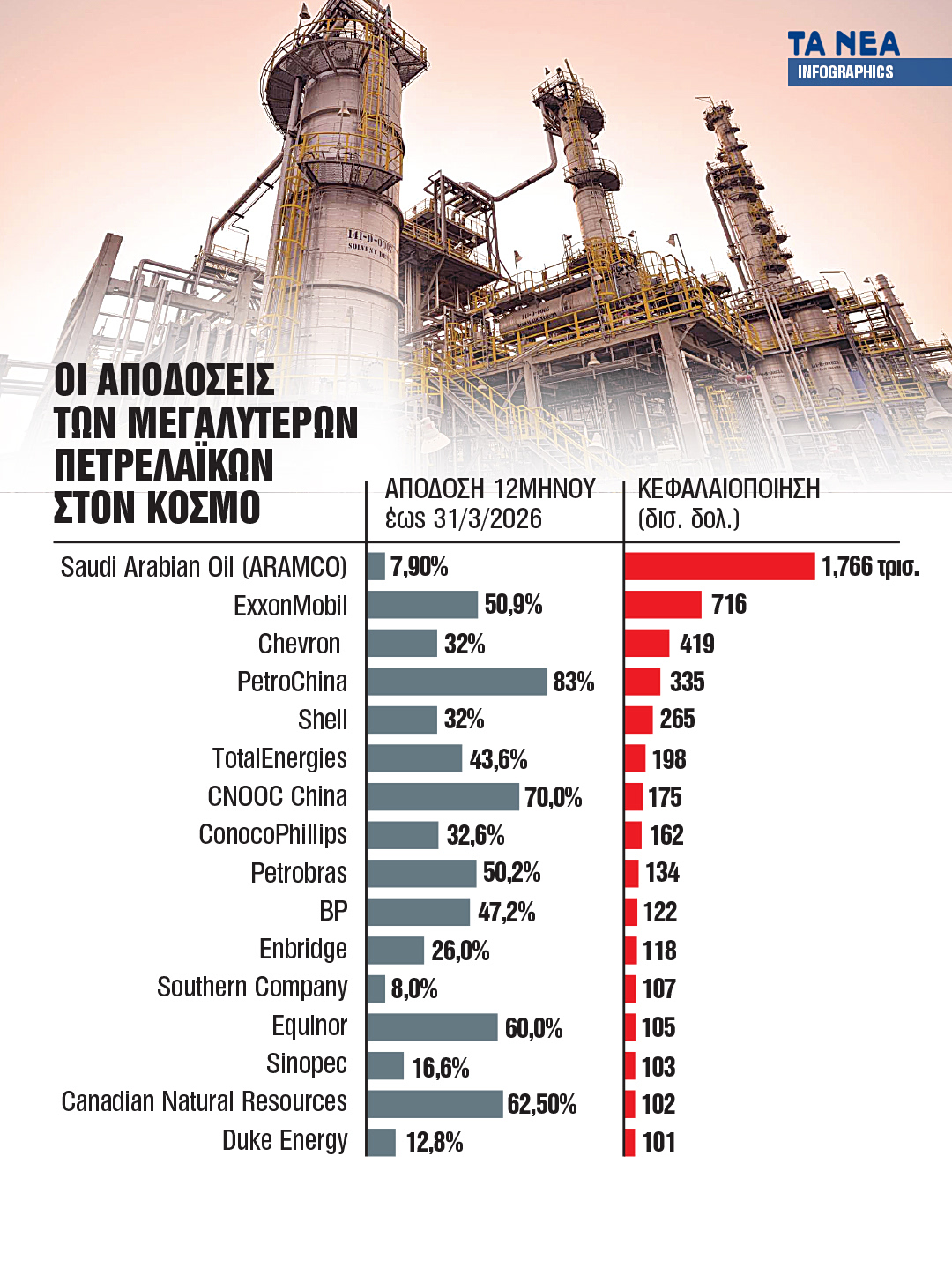 Οι μετοχές της Exxon και της Chevron είχαν επίσης ενισχυθεί σημαντικά από την έναρξη του πολέμου στο Ιράν. Η χρηματιστηριακή αξία της Exxon ανερχόταν στις 31 Μαρτίου στα 716 δισεκατομμύρια δολάρια, ενώ η κεφαλαιοποίηση της Chevron ανερχόταν σε 419 δισεκατομμύρια δολάρια.