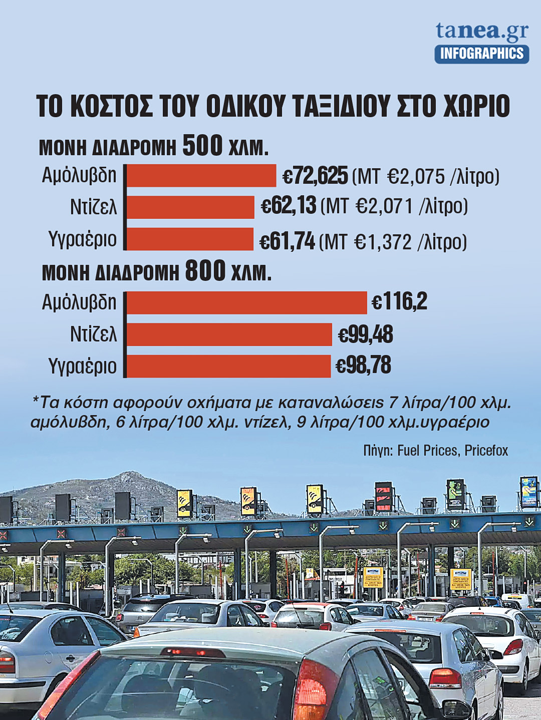Οσον αφορά το κόστος της διαδρομής με επιστροφή, για μια διαδρομή 300 χιλιομέτρων με ένα αυτοκίνητο που έχει κατανάλωση 7 λίτρα/100 χιλιόμετρα το κόστος του ταξιδιού με επιστροφή θα είναι στα 87,15 ευρώ αν καίει αμόλυβδη, στα 74,556 ευρώ αν καίει ντίζελ με κατανάλωση 6 λίτρων/100 χιλιόμετρα και στα 74,088 ευρώ αν καίει υγραέριο με κατανάλωση 9 λίτρων/100 χιλιόμετρα. Σημαντικά υψηλότερο φυσικά θα είναι το κόστος για μεγαλύτερες διαδρομές αλλά και για μετακινήσεις με οχήματα μεγαλύτερου κυβισμού που καίνε και περισσότερα καύσιμα.