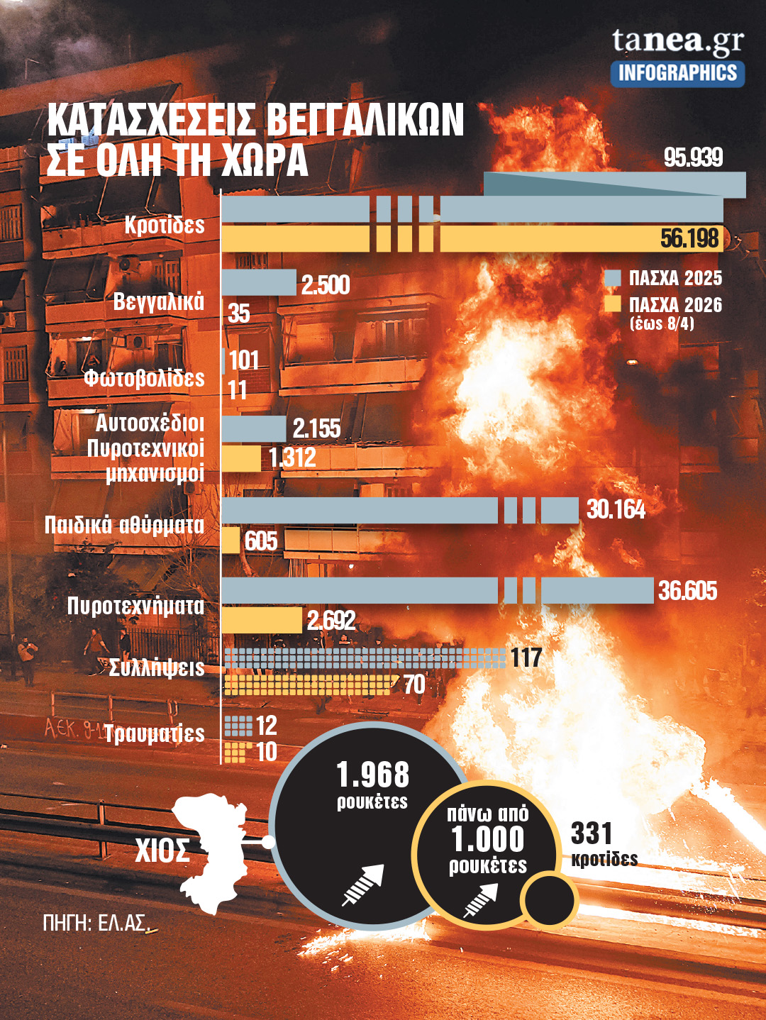 Τα σχετικά στοιχεία της Αστυνομίας αναφέρουν ότι το 2025 βεβαιώθηκαν συνολικά 469 αδικήματα για τη νομοθεσία περί βεγγαλικών, φωτοβολίδων και πυροτεχνημάτων. Από αυτά, τα 123 βεβαιώθηκαν τον Απρίλιο, δηλαδή τον μήνα του Πάσχα. Τα στοιχεία των κατασχέσεων για το περσινό Πάσχα είναι ακόμη πιο αποκαλυπτικά. Οι αρμόδιες Αρχές ανακοίνωσαν ότι κατέσχεσαν 95.539 κροτίδες, 2.500 βεγγαλικά και πάνω από 35.000 πυροτεχνήματα. Επίσης κατασχέθηκαν 2.155 αυτοσχέδιοι πυροτεχνικοί μηχανισμοί, σχεδόν 2.000 εκ των οποίων στη Χίο. Συνολικά έγιναν 117 συλλήψεις. Φέτος, μέχρι τις 5 Απριλίου, η ΕΛ.ΑΣ. είχε προχωρήσει σε κατάσχεση δεκάδων χιλιάδων κροτίδων και εκατοντάδων πυροτεχνημάτων, βεγγαλικών και φωτοβολίδων.
