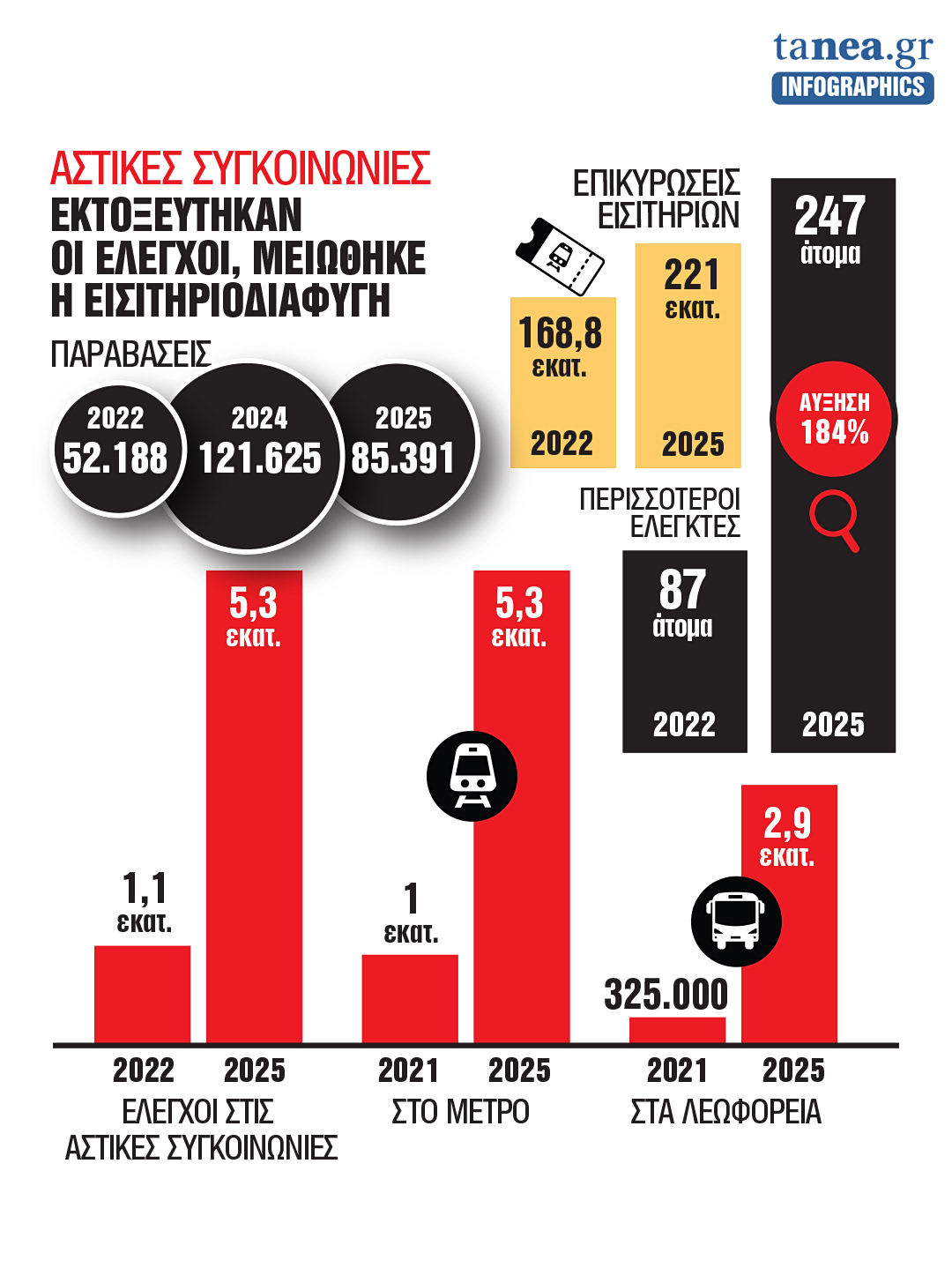 Στο Μετρό, που λειτουργεί υπό τη ΣΤΑΣΥ, οι έλεγχοι σχεδόν πενταπλασιάστηκαν μέσα σε μία πενταετία, φτάνοντας από περίπου 1 εκατ. το 2021 σε πάνω από 5,3 εκατ. το 2025.