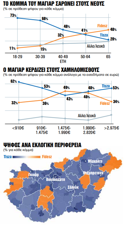 Το Tisza, το κόμμα του Πέτερ Μαγιάρ, σάρωσε στις νεαρές ηλικίες. Σύμφωνα με ανάλυση του ινστιτούτου Median, ψηφίστηκε από το 73% των ψηφοφόρων 18-29 ετών και από το 68% των ψηφοφόρων 30-39 ετών. Το Fidesz, το κόμμα του Βίκτορ Ορμπαν, παρουσιάζει την αντίθετη εικόνα: ψηφίστηκε από το 15% των νέων, με το ποσοστό του να ανεβαίνει με την ηλικία και να φτάνει το 48% στους άνω των 65 ετών.