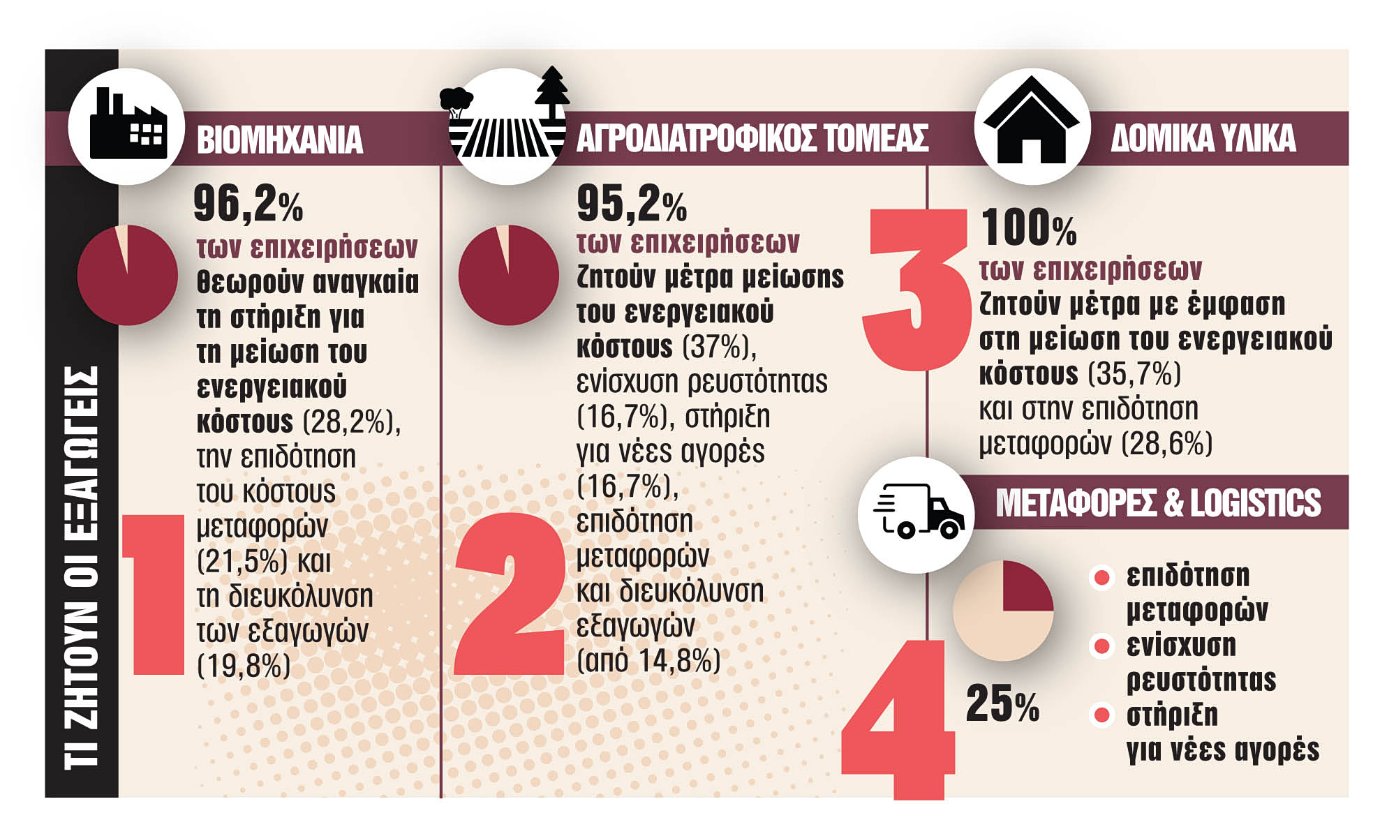 Η έρευνα που έγινε με σκοπό την καταγραφή των επιπτώσεων που αυτές επιφέρουν στην εξαγωγική δραστηριότητα των επιχειρήσεων έδειξε επίσης ότι στον αγροδιατροφικό τομέα, το ποσοστό των επιχειρήσεων που αντιμετωπίζουν μείωση ζήτησης ανέρχεται σε 71,4%, στα δομικά υλικά το 60,% των επιχειρήσεων αναφέρει επιπτώσεις, κυρίως μέτριου (66,7%) και μικρού βαθμού (33,3%), ενώ στις υπηρεσίες και στις μεταφορές και τα logistics το 66,7% των επιχειρήσεων δηλώνει μείωση ζήτησης.