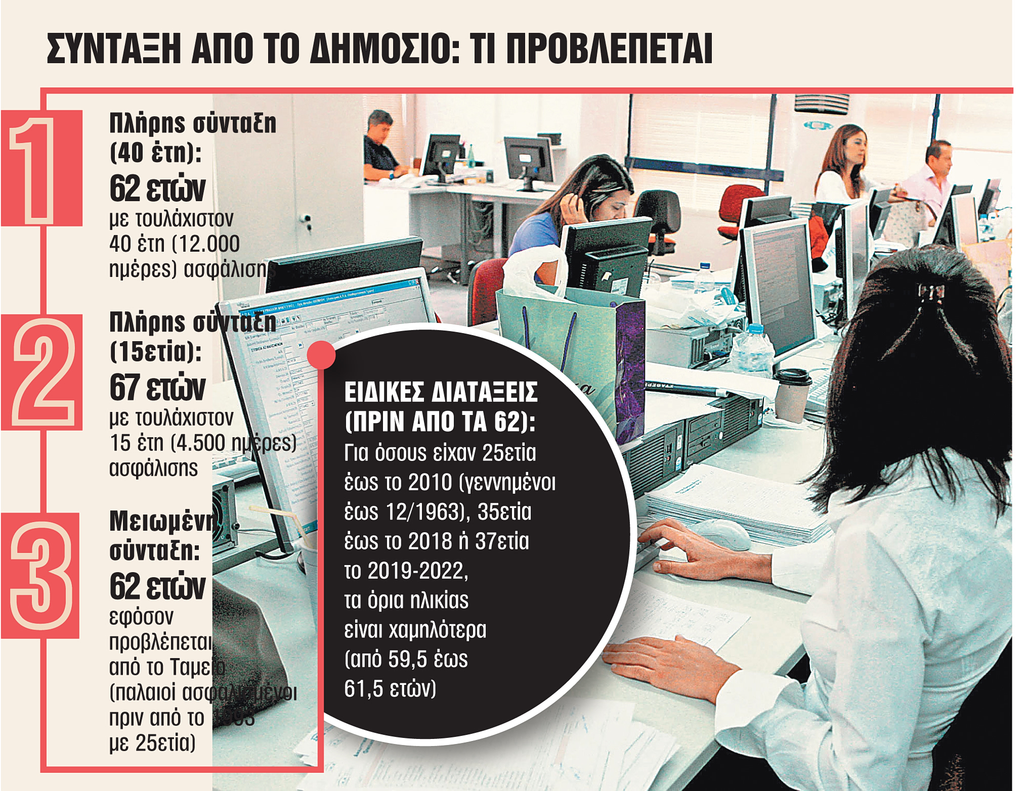 Ειδικότερα η έξοδος για πρόωρη σύνταξη στο Δημόσιο πριν από τα 62 αφορά κατά κανόνα τους παλαιούς, πριν από το 1993, ασφαλισμένους και δεν συνεπάγεται απαραίτητα ότι θα έχουν και το πέναλτι της μειωμένης σύνταξης που ισοδυναμεί με μείωση 30% στο ποσό της εθνικής σύνταξης.