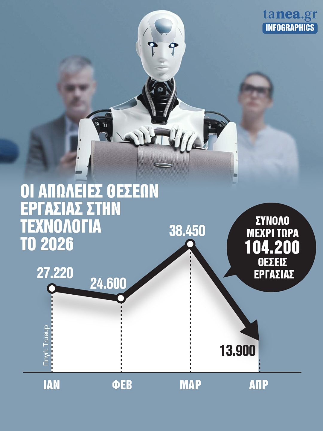 Τα στοιχεία είναι αποκαλυπτικά. Μέχρι τώρα και μέσα στο 2026 έχουν ανακοινωθεί 256 «πακέτα» απολύσεων σε εταιρείες τεχνολογίας, με περισσότερους από 104.000 εργαζομένους να επηρεάζονται. Το 2025, όταν ξεκίνησε έντονα η επίδραση της τεχνητής νοημοσύνης σε επιχειρήσεις, αγορές και οικονομία, είχαν ανακοινωθεί 783 «πακέτα» απολύσεων που επηρέασαν σχεδόν 246.000 άτομα, δείχνουν στοιχεία της εταιρείας Trueup που καταγράφει τέτοιες τάσεις.