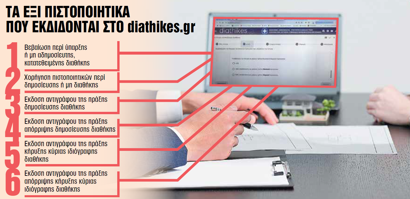 «ΤΑ ΝΕΑ» παρουσιάζουν τα έξι πιστοποιητικά που στο εξής θα μπορεί κάθε πολίτης να αιτείται μέσω της πύλης εισόδου (portal) diathikes.gr. Ποια είναι αυτά; Βεβαίωση περί ύπαρξης ή μη αδημοσίευτης, κατατεθειμένης διαθήκης, χορήγηση πιστοποιητικών περί δημοσίευσης ή μη διαθήκης, έκδοση αντιγράφου της πράξης δημοσίευσης διαθήκης, έκδοση αντιγράφου της πράξης απόρριψης δημοσίευσης διαθήκης, έκδοση αντιγράφου της πράξης κήρυξης κύριας ιδιόγραφης διαθήκης και έκδοση αντιγράφου της πράξης απόρριψης κήρυξης κύριας ιδιόγραφης διαθήκης.