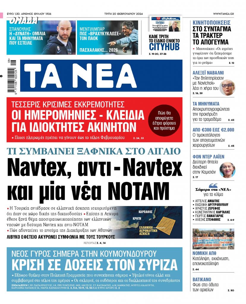 Media Στα «ΝΕΑ» της Πέμπτης: Οι Τούρκοι επέστρεψαν στο ΑιγαίοΜπαράζ παραβιάσεων μετά από μήνες • Με έξι σχηματισμούς αεροσκαφών προκάλεσαν αναχαιτίσεις από ελληνικά μαχητικά 21/11/2024 00:50