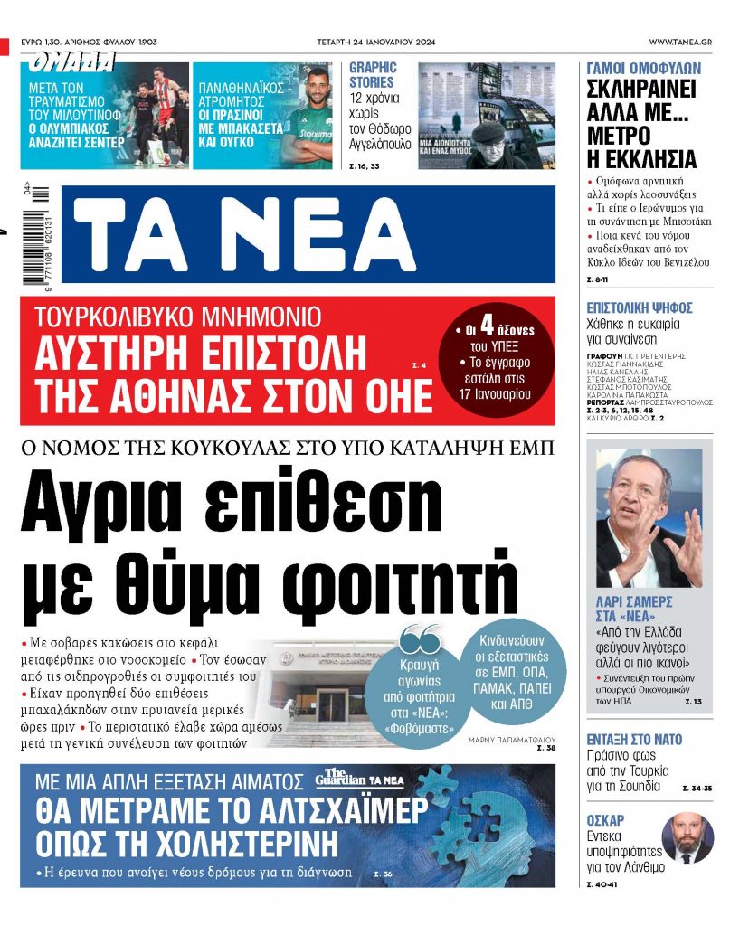 Media Στα «ΝΕΑ» της Τετάρτης: Αγρια επίθεση με θύμα φοιτητήΟ νόμος της κουκούλας στο υπό κατάληψη ΕΜΠ • Με σοβαρές κακώσεις στο κεφάλι μεταφέρθηκε στο νοσοκομείο 24/01/2024 01:04
