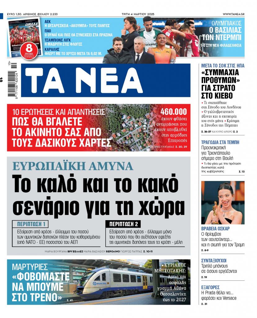 Media Στα «ΝΕΑ» της Τρίτης: Το καλό και το κακό σενάριο για τη χώρα Ευρωπαϊκή άμυνα – Το καλό και το κακό σενάριο για τη χώρα 04/03/2025 00:53