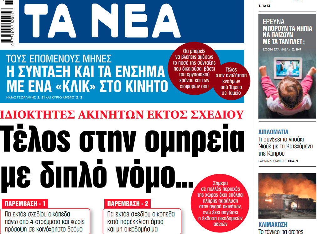 Media Στα «ΝΕΑ» της Τετάρτης: Πρόστιμο 10% στην αξία του ακινήτουΠέναλτι-σοκ για τους ιδιοκτήτες – Αφορά επαγγελματικούς χώρους (γραφεία, καταστήματα κ.λπ.) 28/02/2024 01:08