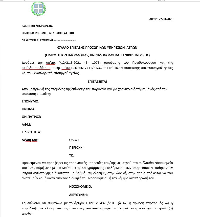 Ελλάδα Αυτό είναι το φύλλο επιστράτευσης των γιατρών – Φυλάκιση τουλάχιστον 3 μηνών σε όποιον αρνηθείΤο έγγραφο αναφέρει: Σύμφωνα με το άρθρο 1 του ν. 4325/2015 (Ά 47) η άρνηση παραλαβής και η παράλειψη εκτέλεσης των ως άνω υποχρεώσεων τιμωρείται με φυλάκιση τουλάχιστον τριών (3) μηνών. 22/03/2021 15:56