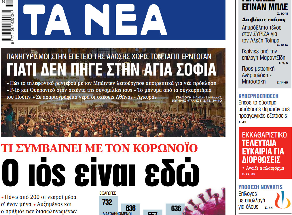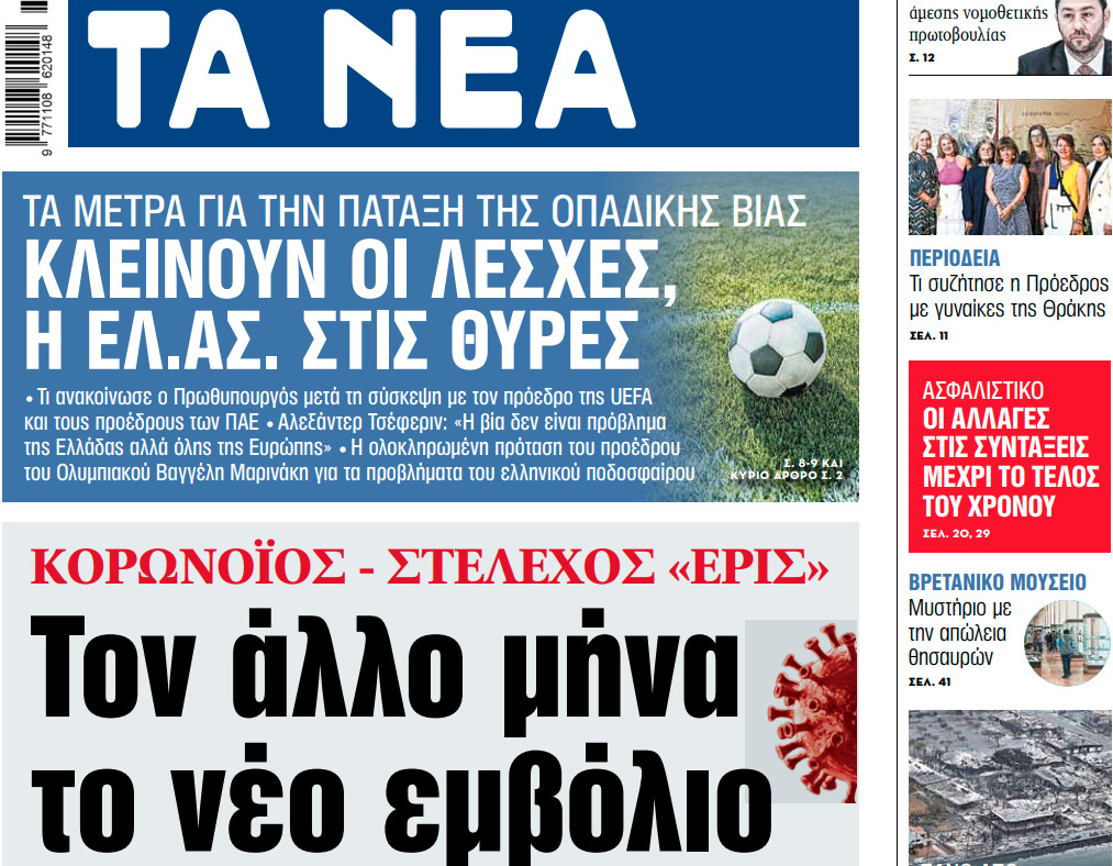 Media Στα «ΝΕΑ» της Παρασκευής: Χωρίς κοροναϊό μέχρι το ΠάσχαΤο σχέδιο της κυβέρνησης για Covid-free νησιά • Σε Αιγαίο και Ιόνιο οι επόμενοι μαζικοί εμβολιασμοί • Πώς θα λειτουργήσει φέτος ο τουρισμός • Επισπεύδονται οι διμερείς συμφωνίες για το πιστοποιητικό εμβολιασμού 05/03/2021 01:13