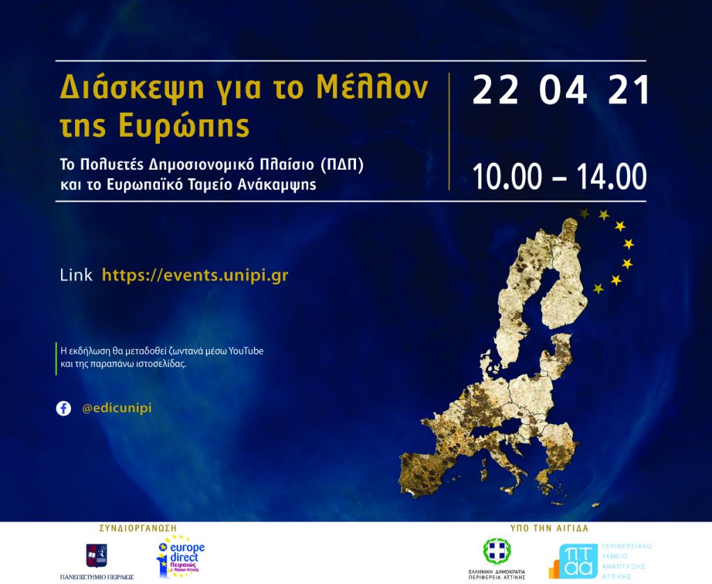 Οικονομία Επίκαιρη ημερίδα για το Πολυετές Δημοσιονομικό Πλαίσιο και το Ευρωπαϊκό Ταμείο ΑνάκαμψηςΗ ημερίδα στο πλαίσιο της “Διάσκεψης της Ευρώπης” έχει στόχο να δώσει στους πολίτες μεγαλύτερο ρόλο στη διαμόρφωση των πολιτικών και των φιλοδοξιών της ΕΕ 21/04/2021 13:56
